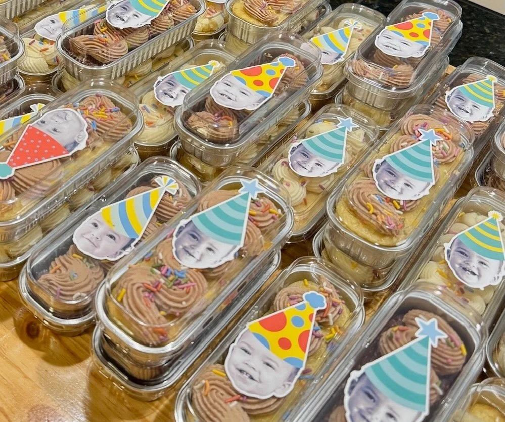 Finish each cake with a fully customized sticker designed for your occasion — birthdays, graduations, weddings, or branded corporate events. Showcase your company logo, colors, and messaging for client appreciation gifts, employee milestones, product launches, or company celebrations. Every detail is tailored to reflect your brand or event theme.